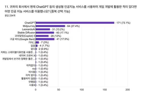 ในการใช้บริการปัญญาประดิษฐ์ในการพัฒนาเกมมีการใช้ ‘ChatGPT’ ถึง 73.1% จากผู้ตอบแบบสอบถามทั้งหมดและมีการใช้ปัญญาประดิษฐ์อื่น ๆ เช่น ‘Midjourney’ (27.4%) ‘Stable Diffusion’ (17.1%) และ ’Leonardo AI’ (13.2%) ตามลำดับ